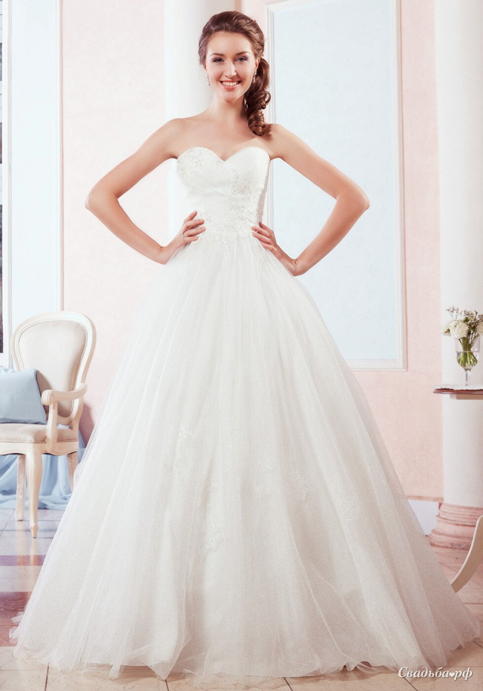 Свадебное платье А-силуэта цвета айвори с французским кружевом на драпированном корсете.
