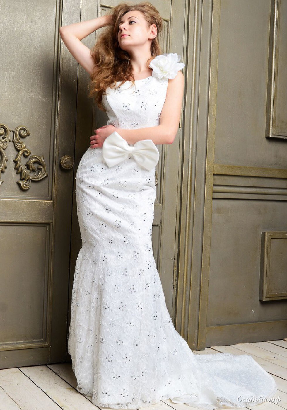 Красивое прямое свадебное платье с бантом, ткань кружево, наличие корсета позволяет подогнать платье точно по фигуре на размер 42-44-46!
