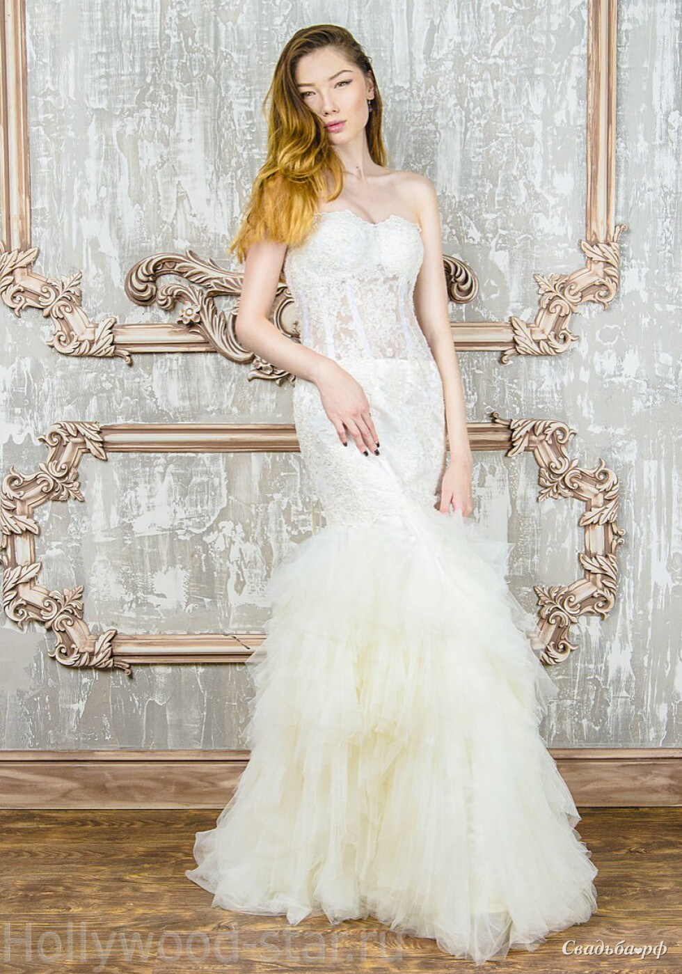 Эксклюзивное красивое платье "Русалка"! Атласный верх дополняет замечательная узкая юбка из шифона. Верхний слой из нежного кружева. Корсет позволяет точно подогнать платье по Вашей фигуре!