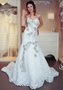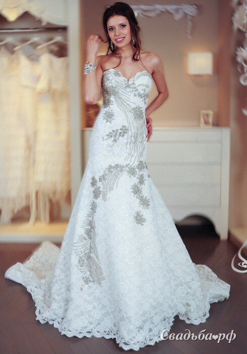 Роскошное платье с открытой зоной декольте и глубоким вырезом. Модель зрительно увеличивает грудь и подчёркивает талию. От середины бедра юбка расширяется и постепенно переходит в длинный шлейф. Платье украшено ручной вышивкой и тонким кружевом. Платье отвечает требованиям самых взыскательных невест.