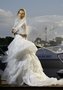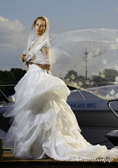 Белоснежное платье с глубоким вырезом и короткими рукавами-фонариками. Модель эффектно подчёркивает все достоинства фигуры. Длинная юбка украшена объёмными сборками и лёгкой тканью. Длинный шлейф дополняет образ. Отлично выглядеть Вам помогут тонкие элегантные перчатки.