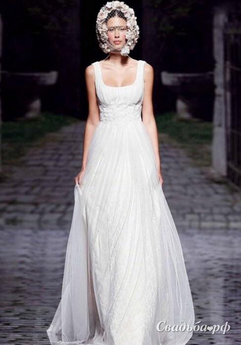 Очень нежное свадебное платье для такой же нежной и трогательной невесты. Лиф с широкими бретелями выгодно подчёркивает формы. Импровизированная шнуровка красиво обозначает линию талии. А длинная юбка, состоящая из нижнего более плотного и верхнего прозрачного слоёв, делает образ невесты загадочным и волшебным. Запись на примерку по телефонам: 8(495) 233 3703, 8(495) 233 3713