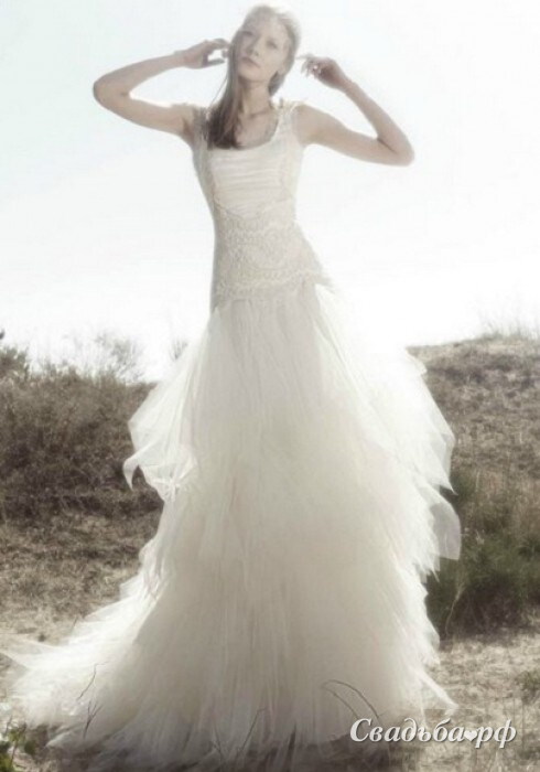 Это модель свадебного платья состоит из строгого лифа с широкими бретелями и заниженной талией и пышной юбки из множества тканевых лепестков. Настолько пышная юбка делает невесту воздушной и невесомой. Лиф тоже не так прост, как может показаться, - по всей длине он задекорирован изысканным кружевом. Запись на примерку по телефонам: 8(495) 233 3703, 8(495) 233 3713