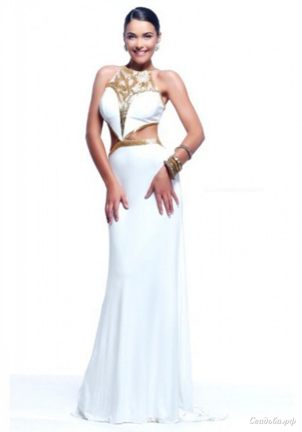Свадебное (вечернее) длинное платье, материал стрейч. Верх платья в виде топа. Лиф с чашечками. Вырез закрытый под горло. Бюст и спина расшито узорами из бисера на прозрачной ткани. Состав: 100% полиэстер. Индивидуальный пошив в любом цвете 20 дней с любыми изменениями или дополнениями!