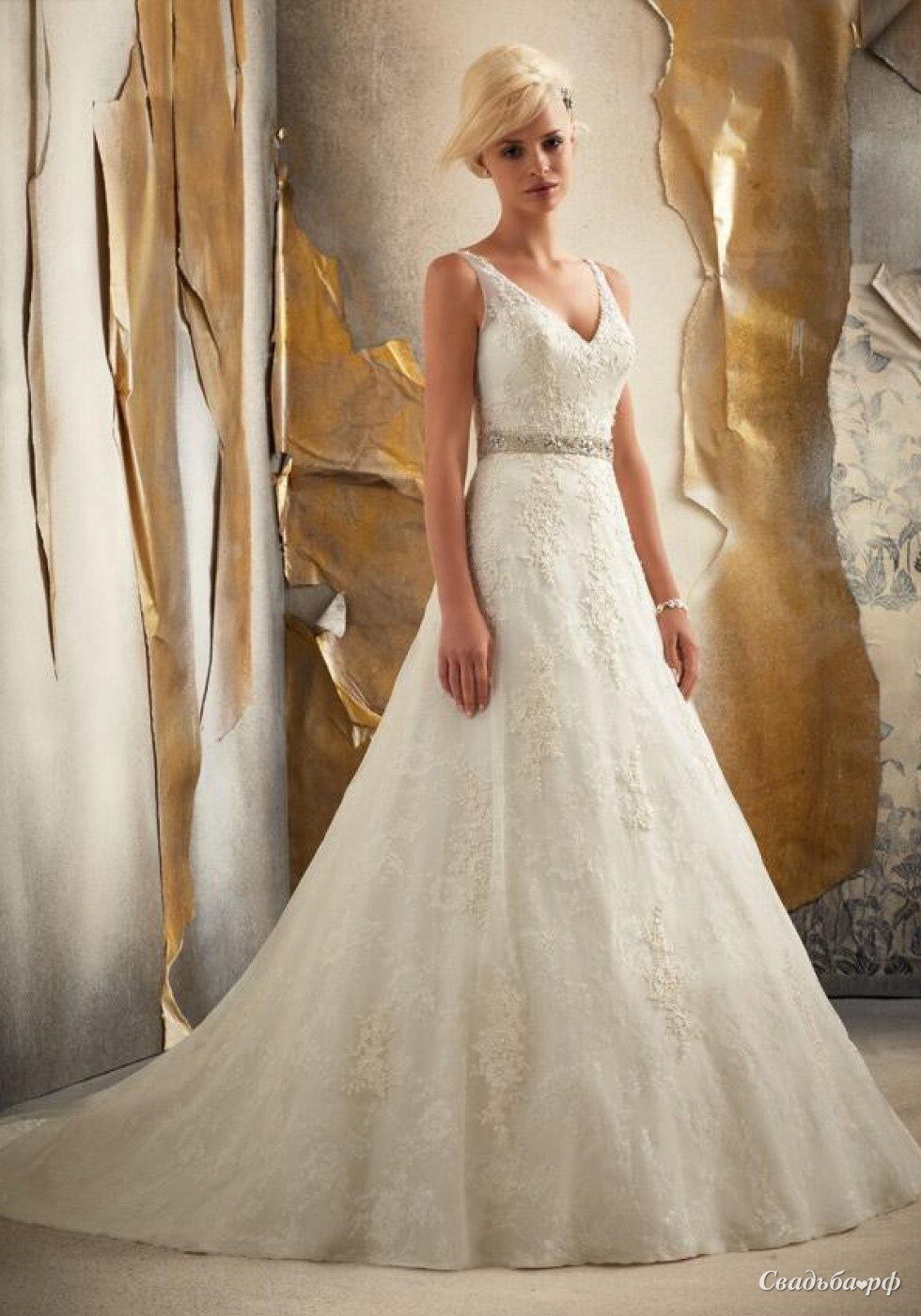 Свадебное платье с бретелями расшито кружевом. Корсет выполнен c V-образным вырезом. Пояс с кристаллами придает нежность модели. Подкладка - сатин. Спина платья на скрытой молнии с декоративными маленькими пуговичками. Сзади шлейф. Индивидуальный пошив по вашим меркам 20 дней с любыми дополнениями или изменениями.