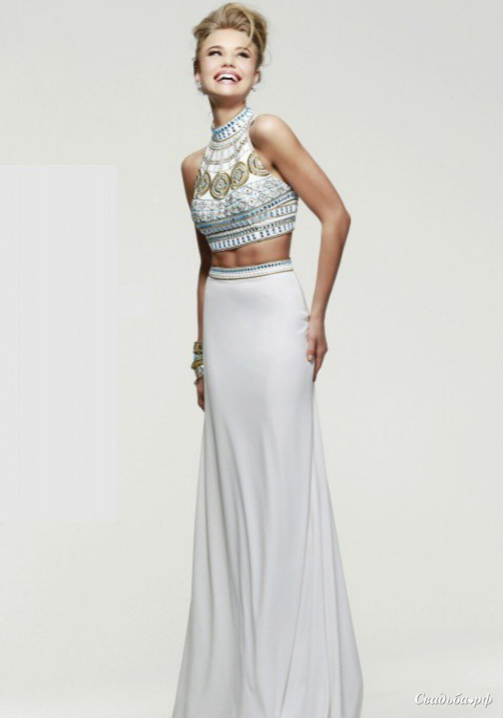 Вечернее (свадебное) платье состоящее из двух частей - топ и юбка. Топик полностью расшит бисером и кристаллами. Лиф с чашечками. Вырез закрытый под горло. Юбка выполнена из ткани стрейч, сзади платья небольшой шлейф. Состав: 100% полиэстер. Индивидуальный пошив в любом цвете 20 дней с любыми изменениями или дополнениями! Эволет Бутик, www.avolet.ru, тел.: 8(915)-101-21-51
