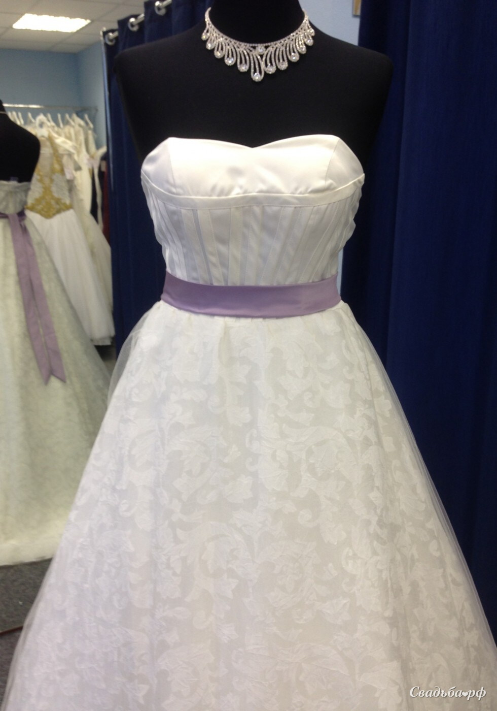 Лаконичный корсет в сочетании с кружевной юбкой и длинным шлейфом прекрасно дополняет лавандовый поясок, который вносит в платье изюминку. Застежка на молнию. Размер 44.