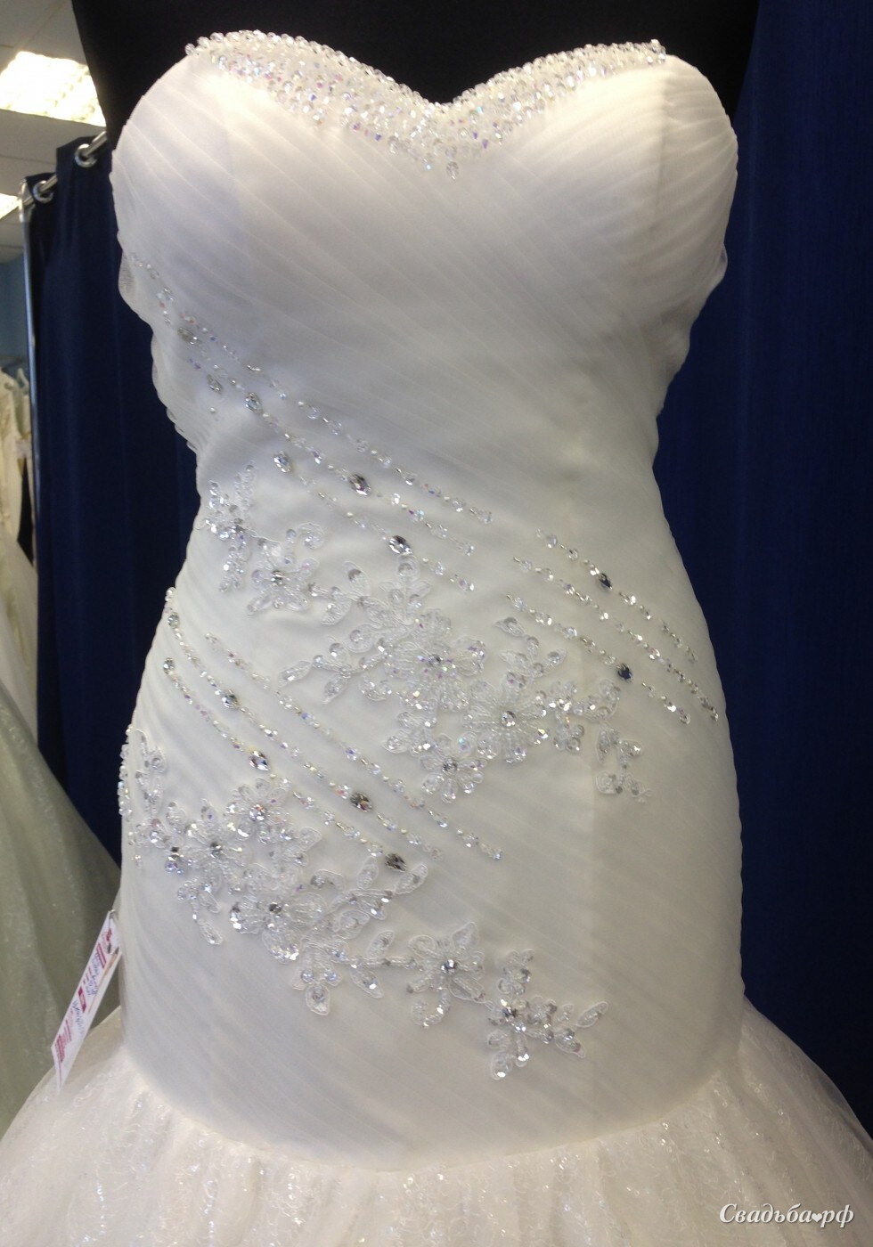 Платье нежного цвета айвори украшено серебристыми пайетками и кристаллами Swarovski. Юбка платья расшита золотистыми нитями, словно морозными узорами. Силуэт «русалка», открытые плечи, шлейф и вырез «сердечко» – Вам позавидует сама Снежная Королева! Размер 42-46.