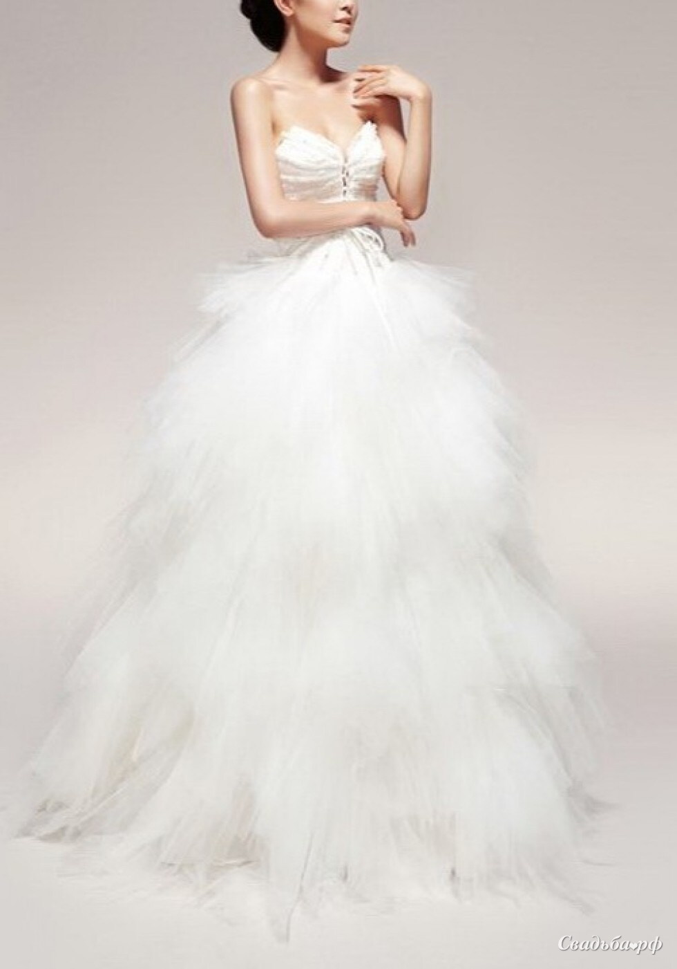 Это платье, словно экзотическая птица: с каждой стороны раскрывается разными видами. Невозможно не смотреть на невесту в таком уникальном наряде: корсет прекрасно подчеркивает изгибы и волнующие формы, а каскад воланов на юбке легко вскружит голову кому угодно! Наслаждайтесь произведенным впечатлением! Размер 40-42 и 44.