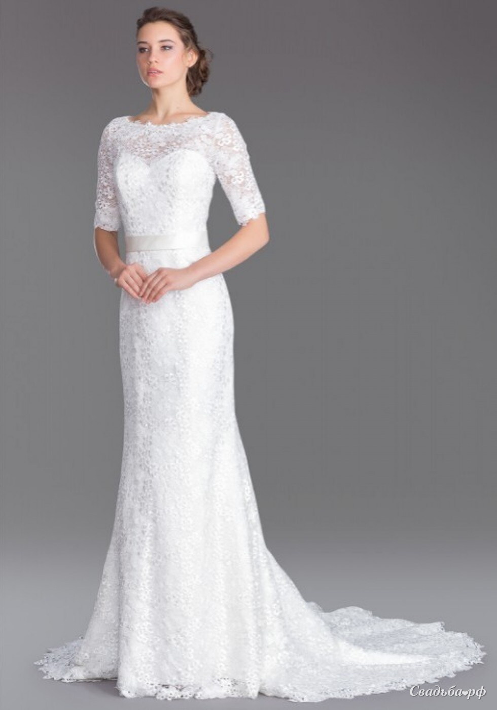 Элегантное кружевное прямое платье из кордового кружева с рукавами. Линия талии эффектно выделена широким цветным поясом, украшенным цветочной композицией в тон пояса. Точеная изысканная модель свадебного платья силуэта "русалка". Нежность и красота этого платья поможет невесте, которая в такой торжественный день желает выглядеть великолепно и неотразимо. Благородство дорогого кордового кружева, используемого в основе этого элегантного свадебного платья, создает образ утонченной и разборчивой леди, которая знает себе цену. 44 (Грудь....88.8 Талия....68.5 Бедро....97.7)