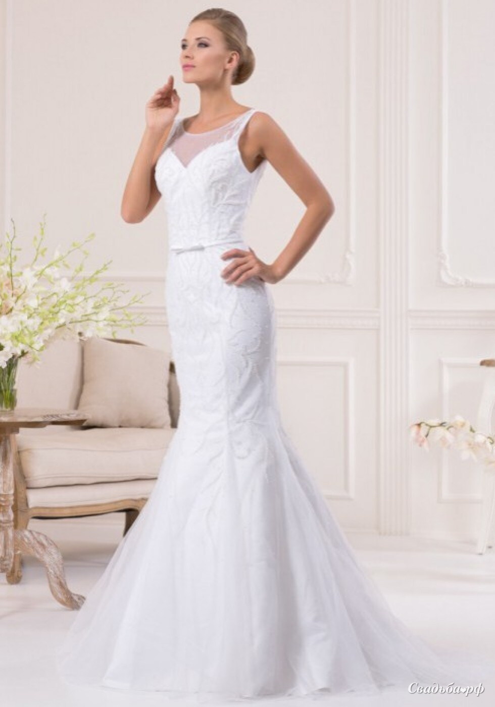 Элегантное кружевное платье, расшитое пайетками. Зона декольте кокетливо прикрыта полупрозрачной сетчатой тканью, которая переходит на бретели и спускается вдоль соблазнительно обнажённой спины. Линия талии выделена тонким атласным пояском с элегантным бантиком. Юбка силуэта русалочка продолжается романтичным шлейфом. Размеры: 42 (Грудь....84 Талия....66 Бедро....92)