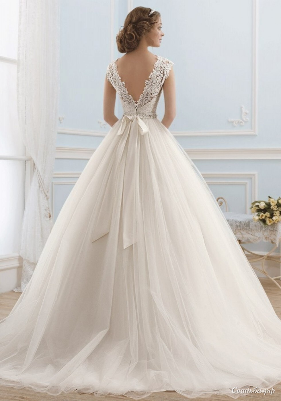 Пышная фатиновая юбка, кружевной верх без рукавов, на спине очаровательный V-образный вырез, атласный пояс, расшитый камнями.