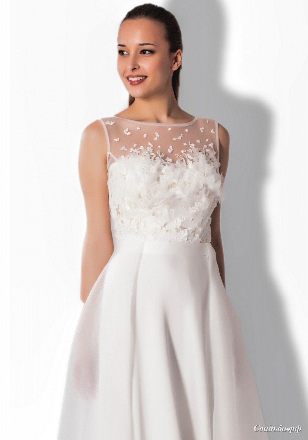Это универсальный нарядный комплект. Многослойность, прозрачность, цветочная вышивка - модные акценты этого сезона. Съемная юбка из органзы подчеркивает X-образный силуэт, тем самым акцентирует внимание на тонкой талии. Нежный декор в области декольте придает образу чувственность, легкость и шарм.