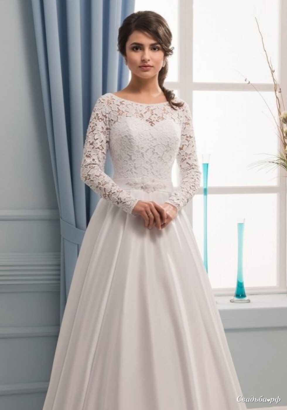 Очень удачное решение как для невест с пышными формами, так и для хрупких девушек. Слегка заниженный корсет на шнуровке позволяет визуально вытянуть фигуру и сделать акцент на талии. На корсете использовано ажурное стрейч-кружево. Образ дополняет длинный рукав, позволяющий скрыть руки. Спинка слегка приоткрыта, не создавая неудобства. Юбка из мягкого атласа формирует красивый а-силуэт, спадает красивыми складками и добавляет модели торжественности. И завершающим штрихом выступает изящный пояс, расшитый стеклярусом и бисером.