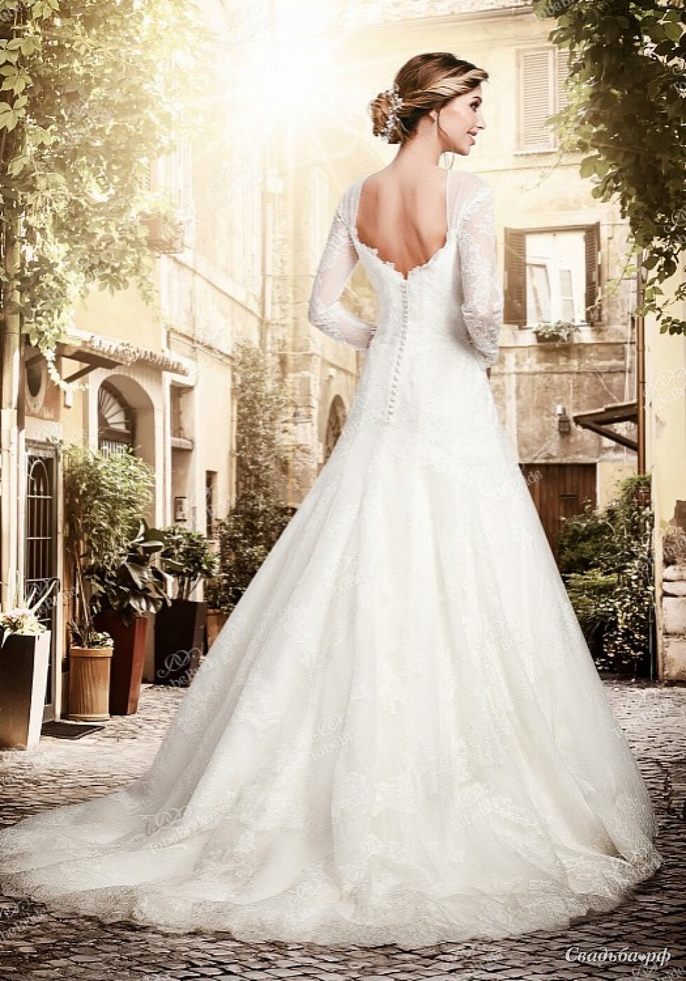 Свадебное платье а-силуэта из кружева с длинными рукавами и шлейфом из новой коллекции 2017-2018 года. Застегивается на пуговицы. Шикарная модель с идеальным кроем подчеркнет Вашу нежность и позволит почувствовать себя королевской особой. Размер USA 8(M-48)