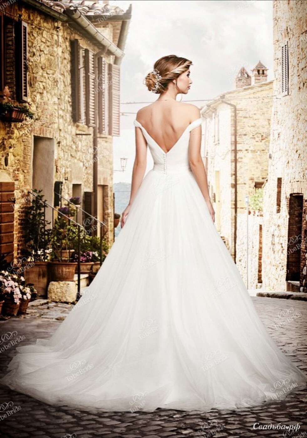 Нежное пышное свадебное платье из коллекции 2017-2018 года из легкого английского фатина с открытыми плечами и спинкой. Прекрасный силуэт подходит для любого типа фигуры: корсет плавно переходит в струящуюся юбку и продолжается легким воздушным шлейфом. Платье декорировано на талии вышивкой из камней и бисера. Позвольте себе быть романтичной принцессой! Размер USA 8 (44-46)