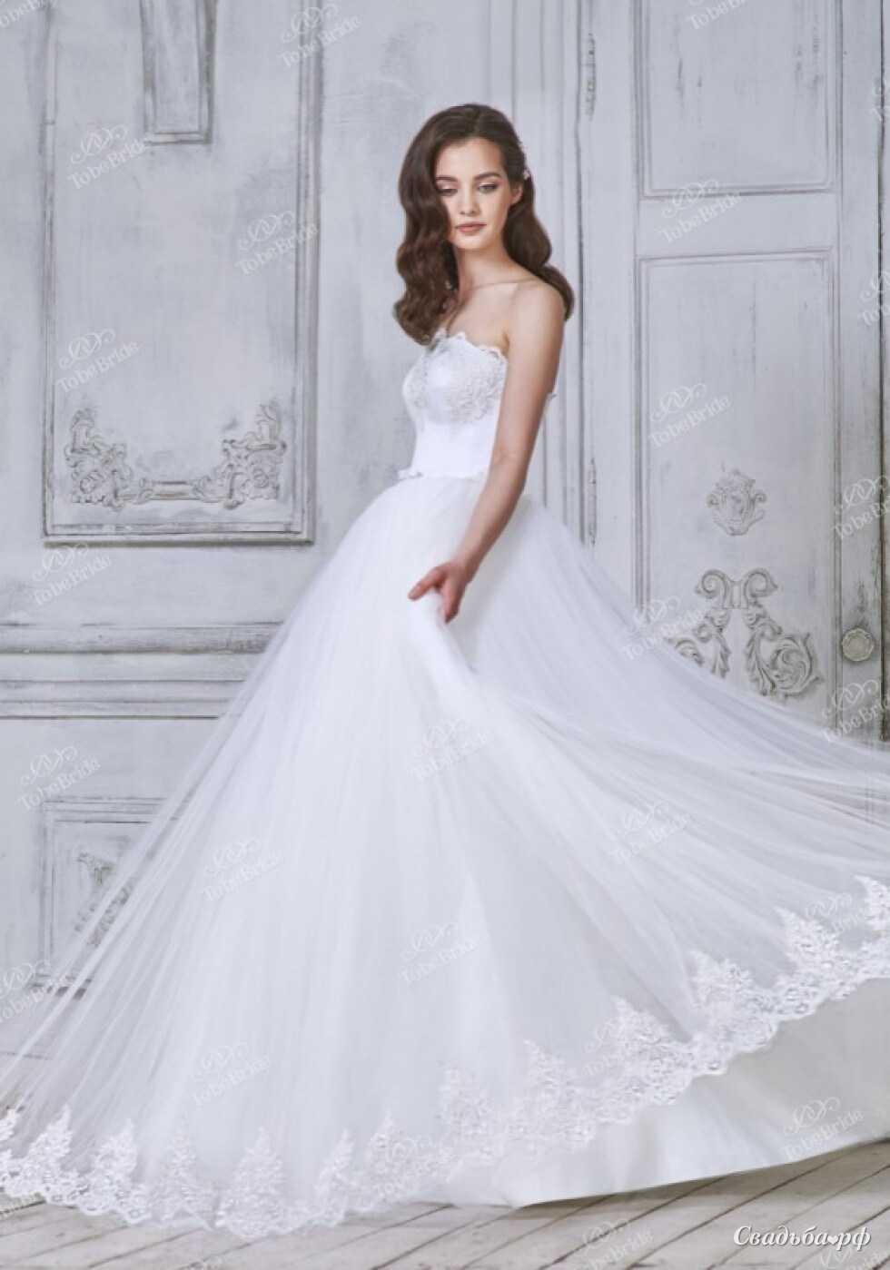 Длинное пышное свадебное платье из фатина и атласа. Верх корсета и низ юбки украшен кружевом. Открытые плечи, корсет на шнуровке.