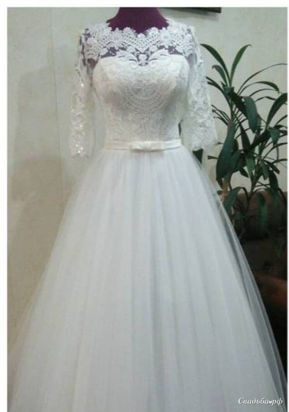 Белое свадебное платье на венчание с кружевным корсетом, рукавами до локтя и легкой юбкой. Кружево на корсете расшито пайетками, спинка на пуговицах.