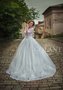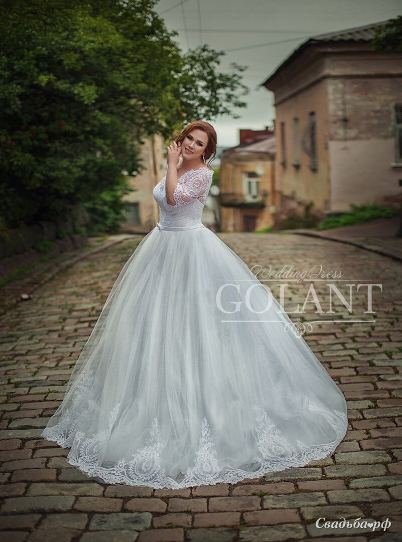 Белое пышное свадебное платье большого размера с рукавами и закрытой спиной на пуговичках.