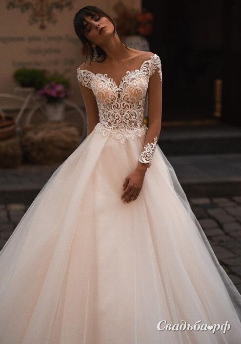 легкое свадебное платье с открытой спиной и длинными рукавами.