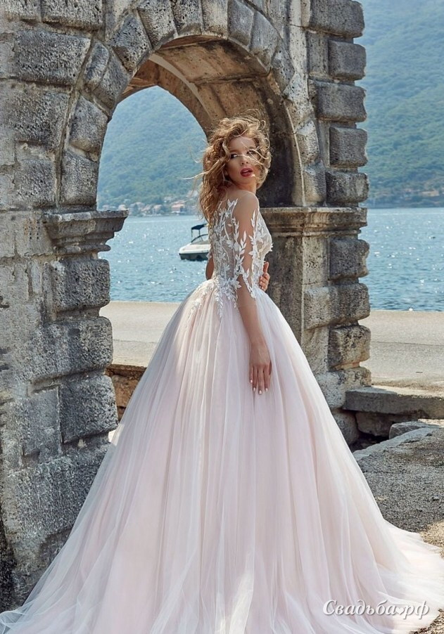 Нежное свадебное платье с цветочным принтом и длинными рукавами на жемчужных пуговицах. Стильное и нежное. Внутренний корсет, спинка на пуговицах.