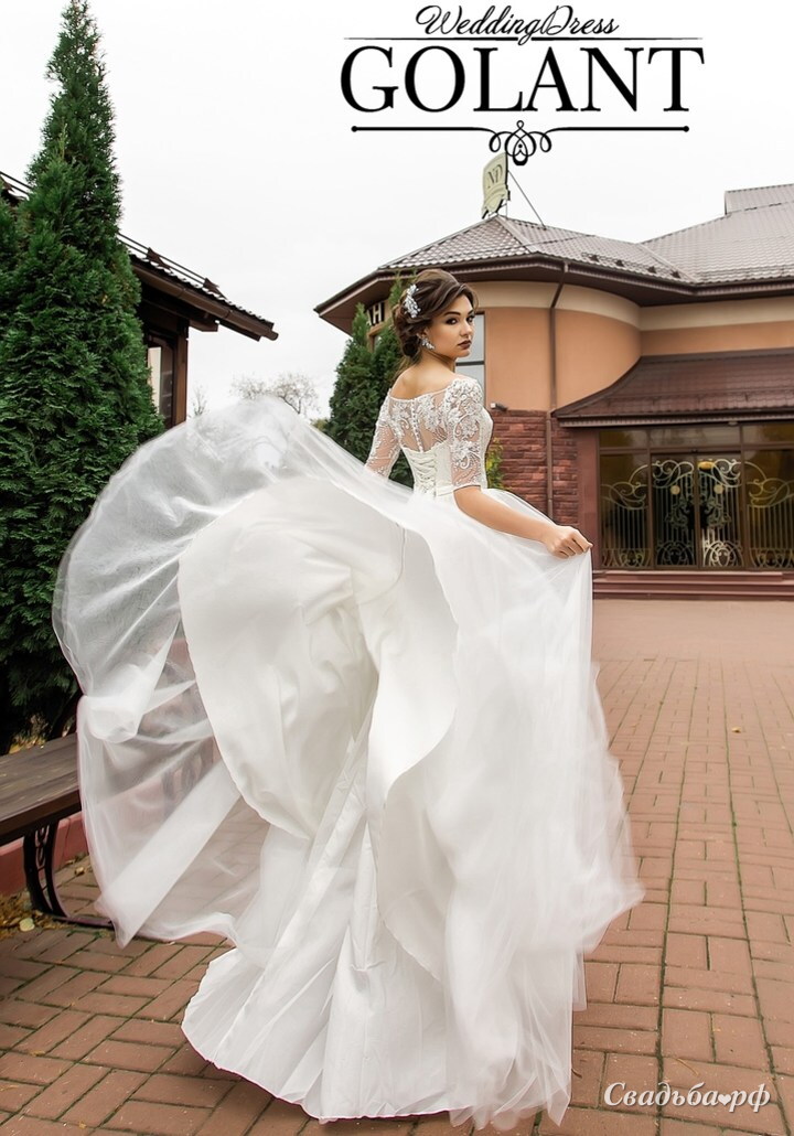 Струящееся воздушное свадебное платье с кружевными рукавами и женственным вырезом лодочка. Лиф расшит пайеткой.