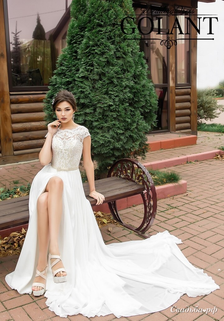 Стильное свадебное платье с легкой шифоновой юбкой со шлейфом. На юбке размер. Спинка открытая.