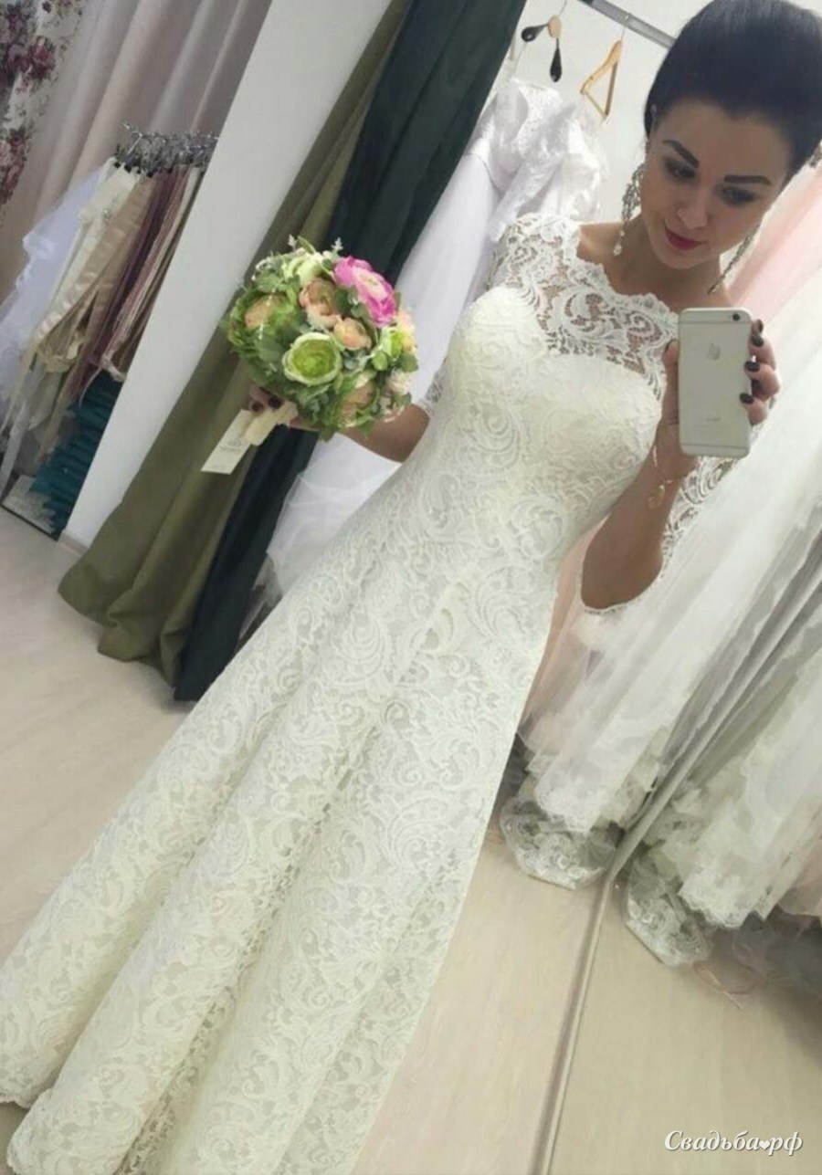 Элегантное свадебное платье для полных невест большого размера. За счет уникального кроя очень стройнить и скрывает неточности фигуры. Спинка капелька. Кружевные рукава 3/4. Подходит на венчание.