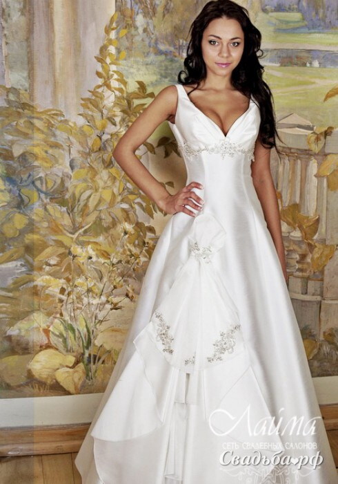Свадебное платье, А-силуэта, расшитое под грудью стеклярусом. Лиф на бретелях, с глубоким декольте.