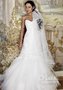 Свадебное платье фасона «Русалочка», с открытыми руками и плечами. Длинная фата, пышные кружевные юбки, расшитый лиф с открытыми плечами.