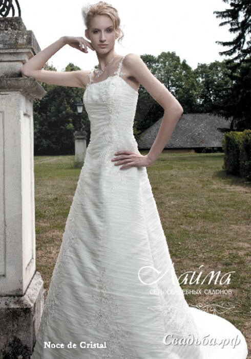 Свадебное платье трапециевидной формы на тонких лямках. Драпированный топ плавно переходит в широкую юбку из плотной ткани. Подойдет под любую фигуру и стиль. В таком платьем вы будете ловить на себе восторженные взгляды окружающих.