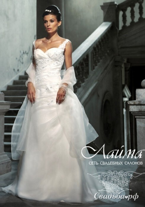 По-французски изысканное свадебное платье. Волнующая линия декольте подчеркнута кружевными бретельками. Заниженный корсет придаст изящности фигуре, а широкая юбка из летящей ткани добавит образу легкости.