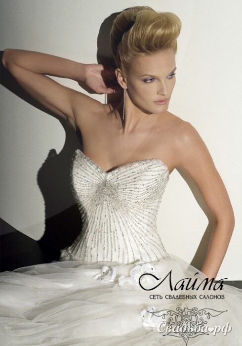 Восхитительное свадебное платье классического силуэта отлично украсит невесту, которая ценит традиции. Роскошный покрой этого наряда, и длинный шлейф, сделает из Вас настоящую принцессу! А корсет, богато украшенный стразами и вышивкой, подчеркнет изящество Вашей талии.
