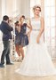 Элегантный прилегающий силуэт с плавно расширяющейся от середины бедра юбкой и роскошный кружевной декор, модный верх-«маечка» с фигурным вырезом на спине и сверкающий пояс – великолепные детали незабываемого свадебного образа!