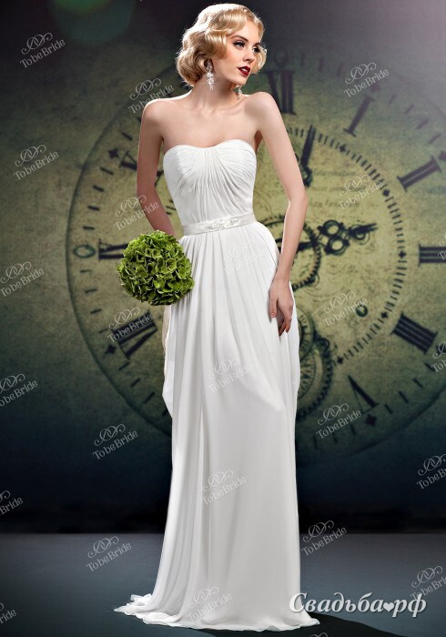 Небожительница, богиня… Идеальный силуэт этого платья не оставляет сомнений, что его обладательница только что спустилась с Олимпа! Изюминки этой модели – сложная драпировка на лифе и по бокам юбки, а также тонкий атласный поясок на линии талии.