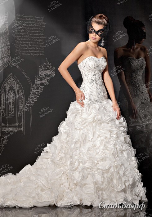 Платье, достойное богини Афродиты. Шлейф юбки струится как морская пена – Вы на гребне успеха! Мерцающая вышивка корсета завершит неповторимый образ. Ткани и отделка: корсет – тафта, юбка – органза; вырез плотно расшит стразами, бисером и стеклярусом.