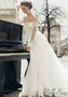 Пышное платье с рукавами и невероятно красивым и оригинальным вырезом-лодочкой. Лиф, рукава и подол платья украшены роскошным французским кружевом