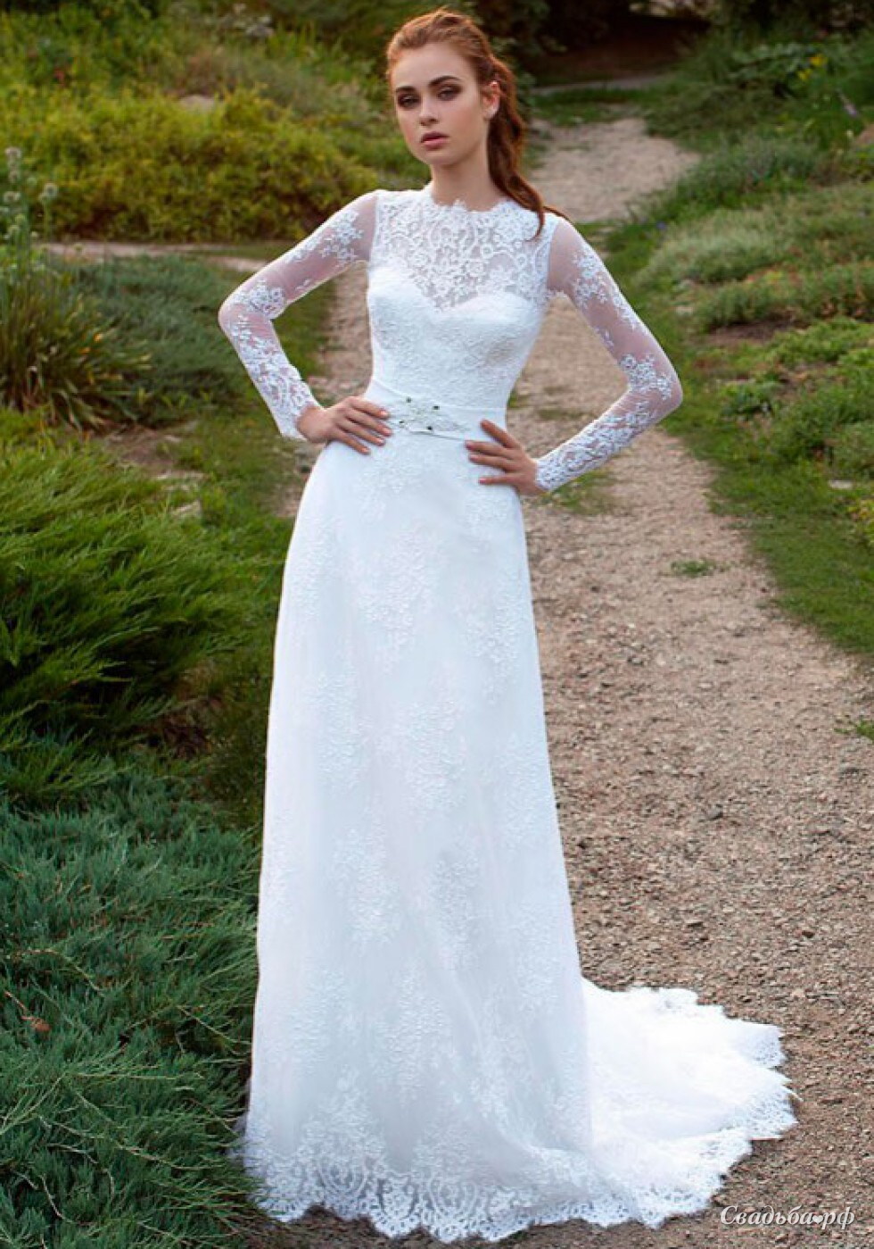 Свадебное платье с рукавчиком. Спинка украшена двойным вырезом.
