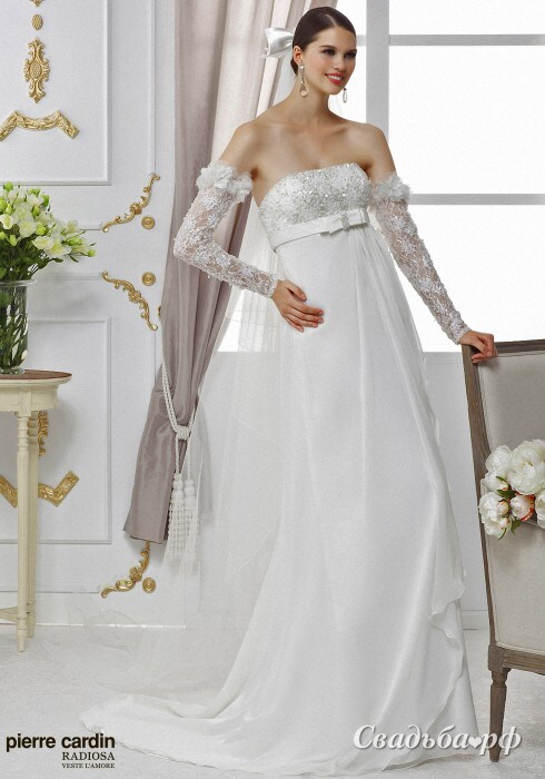 Цена по акции: 7200 руб.----------Нежное свадебное платье в стиле 19-го века поможет вам выглядеть безупречно в самый торжественный день вашей жизни. Представленный наряд от ведущего французского дизайнера Pierre Cardin зрительно вытягивает силуэт и акцентирует внимание на груди. Изящный корсет с открытой зоной декольте и завышенной талией вручную расшит бисером. Длинная юбка дополнена шлейфом.