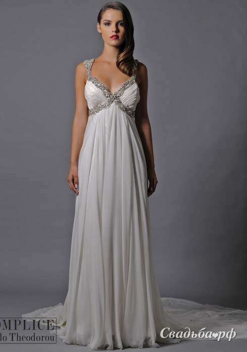 Дизайнерское свадебное платье ручной работы выполнено в греческом стиле. Открытая зона декольте с соблазнительным вырезом подчёркнута изящными бретелями и сверкающей вышивкой по верхнему краю наряда. Эта модель с завышенной талией и длинной юбкой привлекает внимание к бюсту и зрительно вытягивает силуэт. Шикарный шлейф дополняет платье.