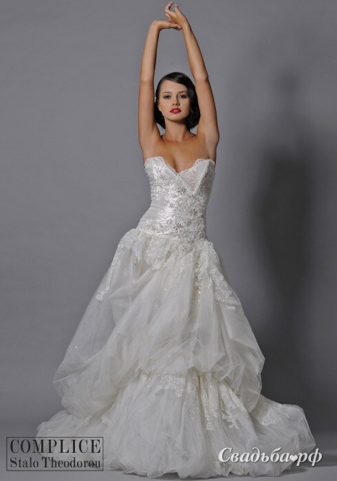 Поистине королевское свадебное платье с соблазнительной зоной декольте придётся по душе даже самым притязательным ценителям прекрасного. Элегантный корсет вручную декорирован кружевом и расшит сверкающими камнями. Длинная юбка с воздушными воланами и сборками придаст вашему образу лёгкость и женственность.