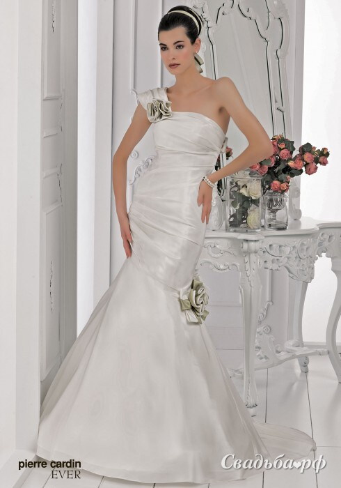 Цена по акции: 3770 руб.----------Если вы хотите почувствовать себя прекрасной русалкой, то это свадебное платье от французского дизайнера Pierre Cardin придётся вам по душе. Заниженный корсет с открытой зоной декольте и единственной бретелью декорирован объёмными цветами контрастного оттенка. От середины бедра юбка расширяется и постепенно переходит в кокетливый шлейф.