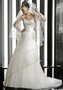 Свадебное платье от дизайнера Pierre Cardin с открытой зоной декольте и тонкими бретелями создано для самых романтичных натур. Верхняя часть драпированного корсета вручную расшита камнями. Длинная юбка с гофрированными элементами дополнена многоярусными воланами из лёгкой ткани и кокетливым шлейфом. Цветок на левом бедре придаёт наряду особый шарм.