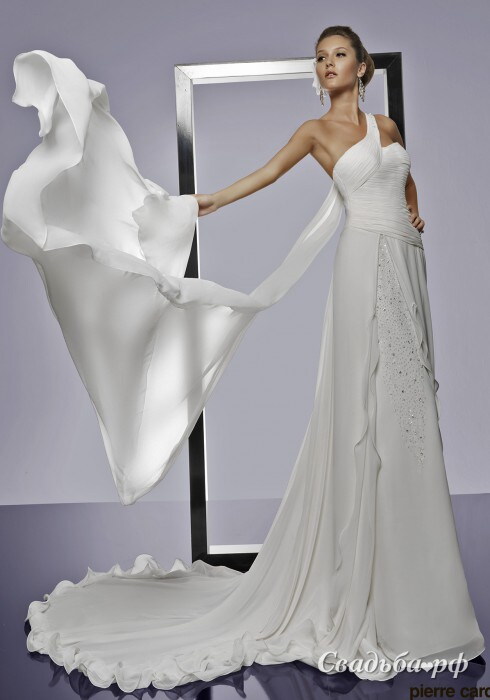 Цена по акции: 7340 руб.----------Струящееся свадебное платье в греческом стиле зрительно вытягивает силуэт и мягко подчёркивает все достоинства фигуры. Верх этого наряда с открытой зоной декольте украшен оригинальной бретелью, переходящей сзади в шлейф. Прямая юбка с воланами из тончайшей ткани придаёт образу женственность и неповторимое очарование.