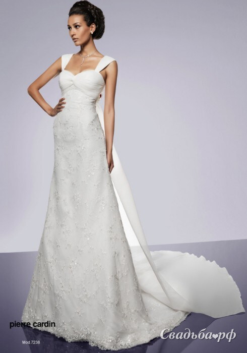 Цена по акции: 8950 руб.----------Элегантное свадебное платье от лучшего французского дизайнера Pierre Cardin придётся по душе невестам с безупречным вкусом. Изящный корсет с открытой зоной декольте и широкими бретелями выгодно подчёркивает соблазнительные изгибы фигуры. Длинная юбка слегка расширяется к полу и переходит в роскошный шлейф, дублируемый тончайшей накидкой от спины.