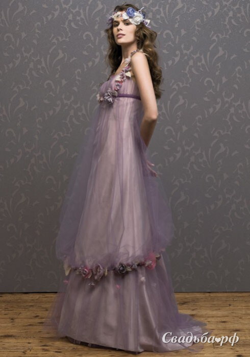 Оригинальное свадебное платье французского производства создано для самых дерзких и эффектных модниц. Верхняя часть наряда с открытой зоной декольте и завышенной талией дополнена объёмными цветами и изящными бретелями. Длинная юбка с небольшим шлейфом драпирована полупрозрачной тканью и декорирована бутонами ручной работы.