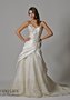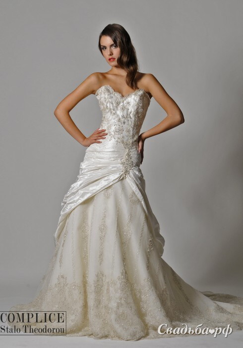 Поистине королевское свадебное платье ручной работы декорировано натуральным кружевом. Элегантный корсет с открытой зоной декольте расшит бисером и сверкающими камнями. Эффектная драпировка юбки и длинный шлейф придают модели особый шарм. Наряд зрительно увеличивает бюст и выгодно подчёркивает талию.