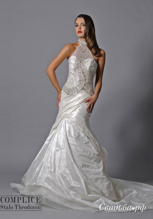 Эксклюзивное свадебное платье ручной работы придётся по душе самым стильным и притязательным невестам. Английская пройма и полупрозрачная вставка на груди привлекают внимание. Корсет расшит сверкающими камнями и бисером. Длинная юбка с оригинальными сборками переходит в роскошный шлейф. Наряд эффектно подчёркивает соблазнительные изгибы фигуры.