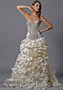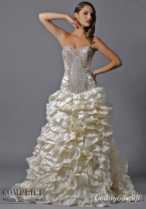 Роскошное свадебное платье ручной работы эффектно подчеркнёт ваши соблазнительные формы и безупречный вкус. Заниженный корсет с открытой зоной декольте расшит сверкающими камнями и бисером. Длинная юбка с многоярусными воланами дополнена кокетливым шлейфом. Наряд поможет создать воздушный образ прекрасной невесты.