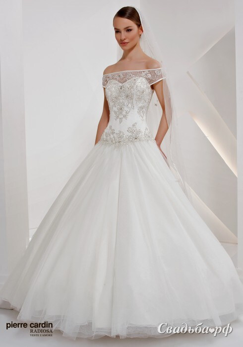 Потрясающее богато декорированное свадебное платье от Pierre Cardin. Основу модели составляет элегантное платье со строгим удлинённым корсетом и пышной юбкой. Корсет полностью обтянут тончайшей полупрозрачной тканью со сверкающей вышивкой из бисера и бусин. Эта ткань кокетливо выступает за контуры фигурного лифа и соблазнительно обтягивается плечи.